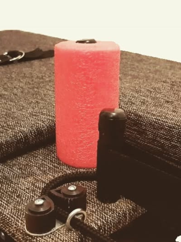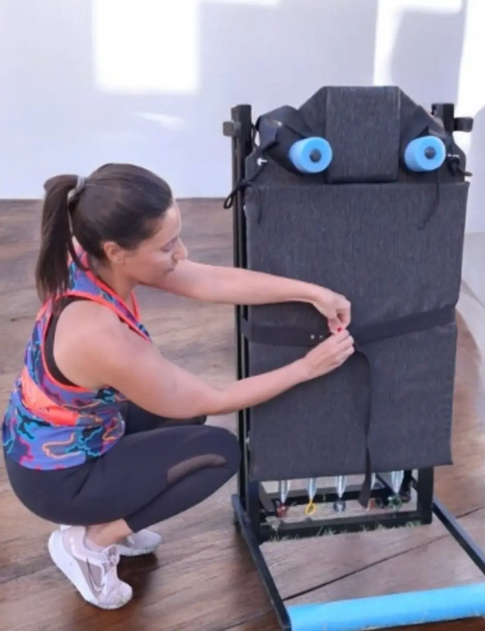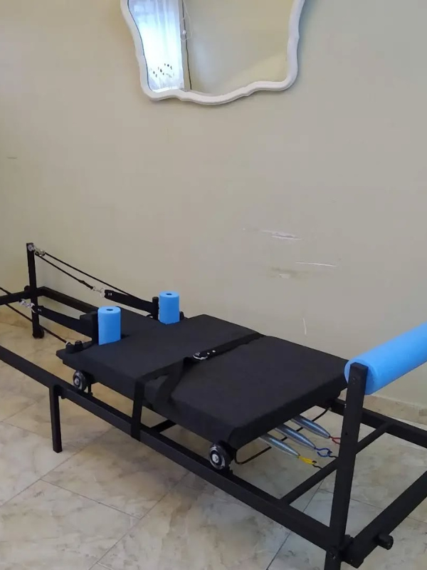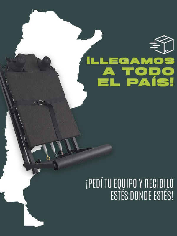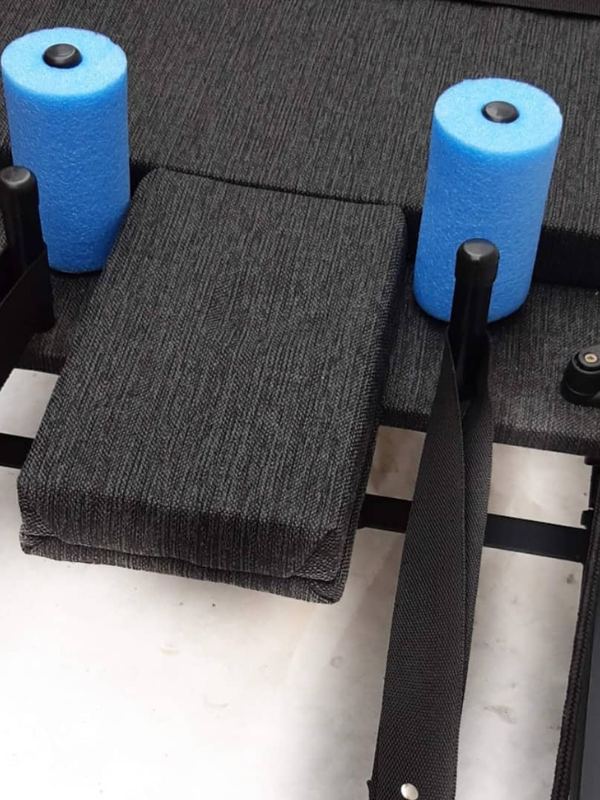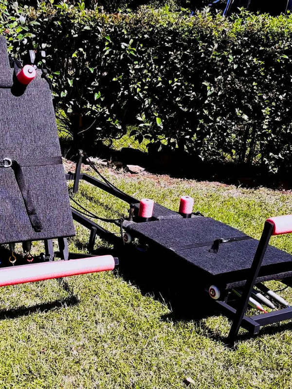 Estructura de hierro con caño estructural. Carro desplazable sobre ruedas siliconadas, acolchado con espuma y tapizado en tela chenille. Hombreras de espuma de polietileno y barra de apoyo. Sogas y accesorios náuticos, resortes acerados. Peso sugerido: hasta 90 kg.